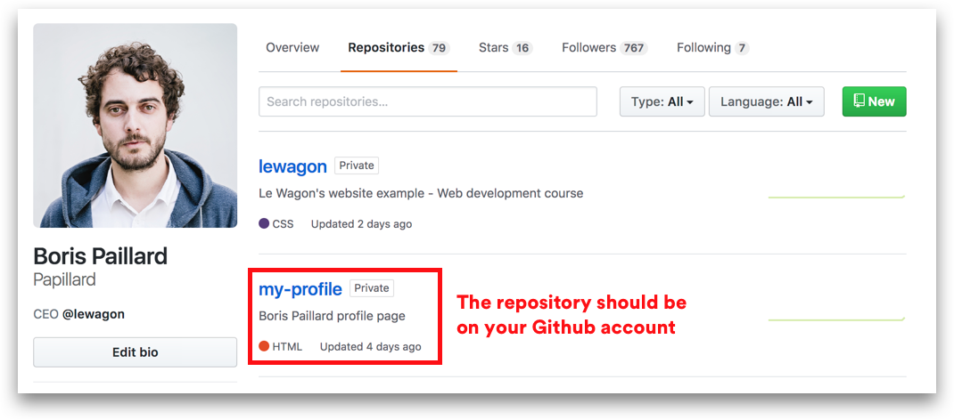Your project my-profile should be on your Github profile after this step. Check that you can find it in your Github repositories.