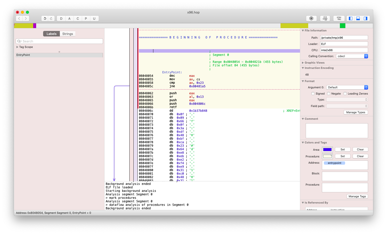 If you notice the hex dump (signaling it doesn’t know how to interpret/decompile things) starts at address 0x804806c, which is the same address that we jump to with that weird retf instruction.