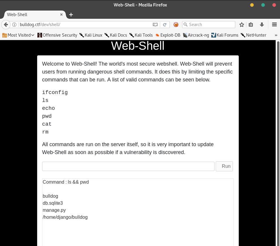 However, armed with a logged-in session, we can access the web-shell! Go to /dev/shell and let’s see what we can do.