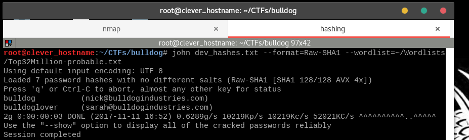 john dev_hashes.txt --format=Raw-SHA1 --wordlist=~/Wordlists/Top32Million-probable.txt