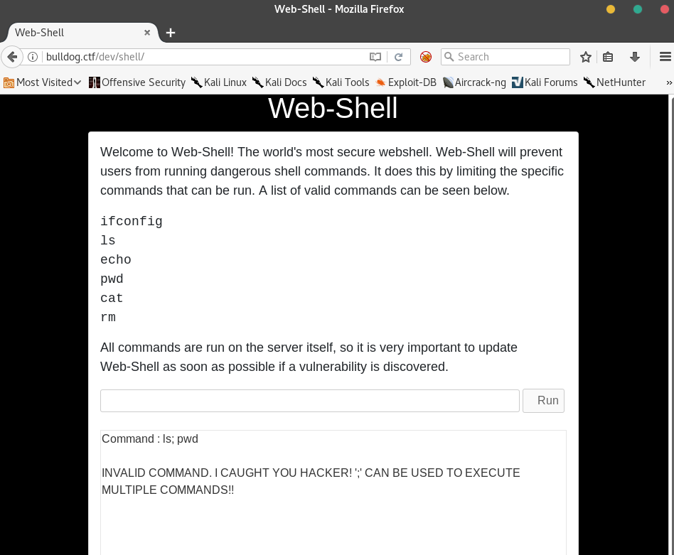 This is promising, but pwd is on the list of approved commands. Let’s try something unapproved, like id, whoami or cd .