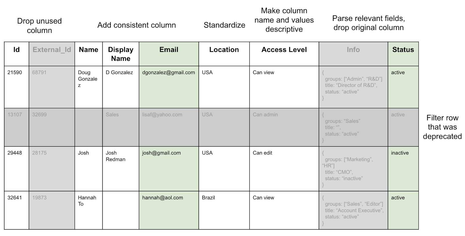 - Flag values should be transformed into relevant strings. If a column billing_status has three n_meric values (i.e. 0, 1, 2) that represent some status, they should be transformed into a relevant business concept such as Active, Not Active, Delinquent.
