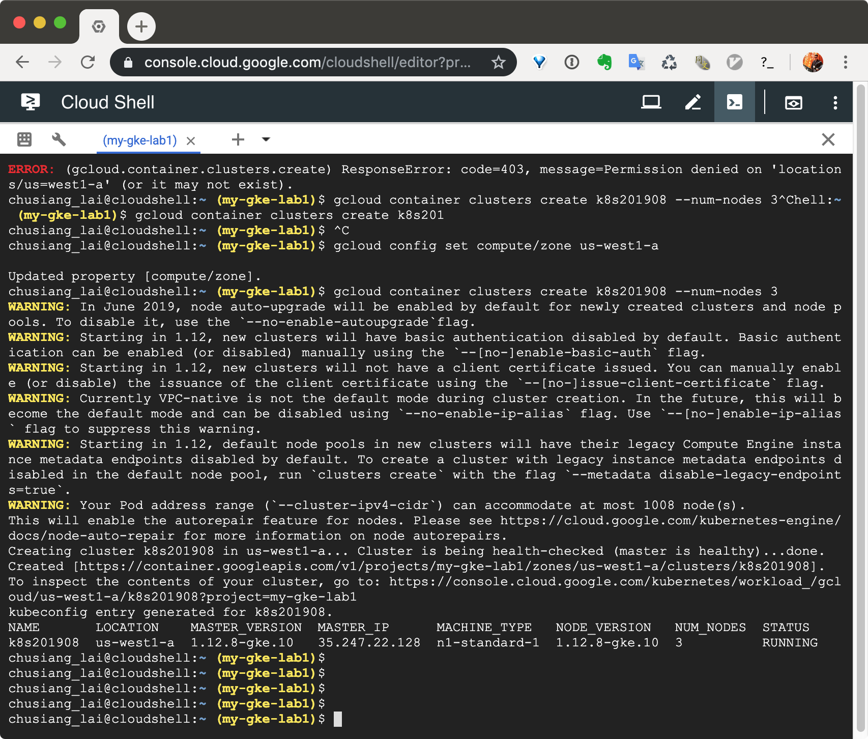 chusiang_lai@cloudshell:~ (my-gke-lab1)$ gcloud container clusters create k8s201908 --num-nodes 3 WARNING: In June 2019, node auto-upgrade will be enabled by default for newly created clusters and node pools. To disable it, use the `--no-enable-autoupgrade` flag. WARNING: Starting in 1.12, new clusters will have basic authentication disabled by default. Basic authentication can be enabled (or disabled) manually using the `--[no-]enable-basic-auth` flag. WARNING: Starting in 1.12, new clusters will not have a client certificate issued. You can manually enable (or disable) the issuance of the client certificate u sing the `--[no-]issue-client-certificate` flag. WARNING: Currently VPC-native is not the default mode during cluster creation. In the future, this will become the default mode and can be disabled using `--no- enable-ip-alias` flag. Use `--[no-]enable-ip-alias` flag to suppress this warning. WARNING: Starting in 1.12, default node pools in new clusters will have their legacy Compute Engine instance metadata endpoints disabled by default. To create a cluster with legacy instance metadata endpoints disabled in the default node pool, run `clusters create` with the flag `--metadata disable-legacy-endpoints=tru e`. WARNING: Your Pod address range (`--cluster-ipv4-cidr`) can accommodate at most 1008 node(s). This will enable the autorepair feature for nodes. Please see https://cloud.google.com/kubernetes-engine/docs/node-auto-repair for more information on node auto repairs. Creating cluster k8s201908 in us-west1-a... Cluster is being deployed...⠏