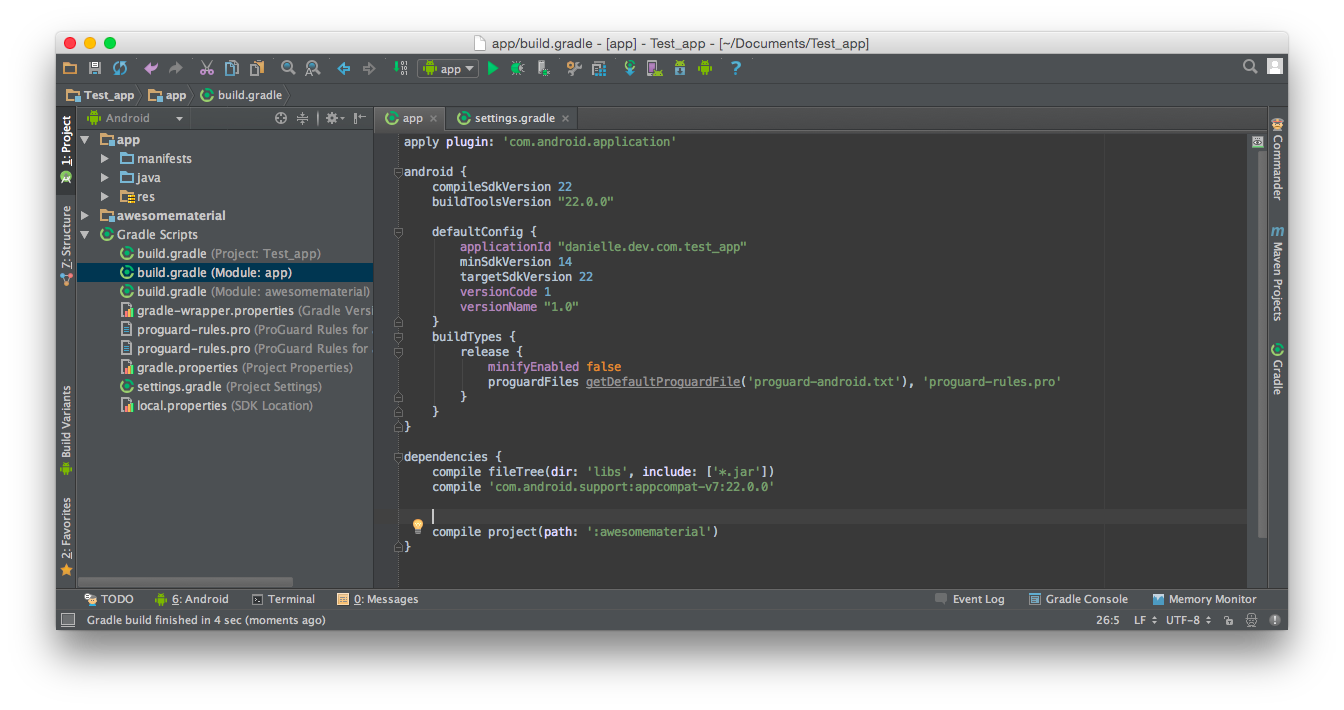 So we're working on creating Android Material Awesome, a library which will hopefully incorperate the benefits of Material Design, Twitter's Bootstrap, and FontAwesome. What we really wanted is a project other people can easily include into their projects using gradle dependencies. To do this we needed to create a standalone library project so we could make it as lightweight as possible for including as a dependency, and a sample app that would use it for testing. These are the steps we took to get started in Android Studio (version 1.1).