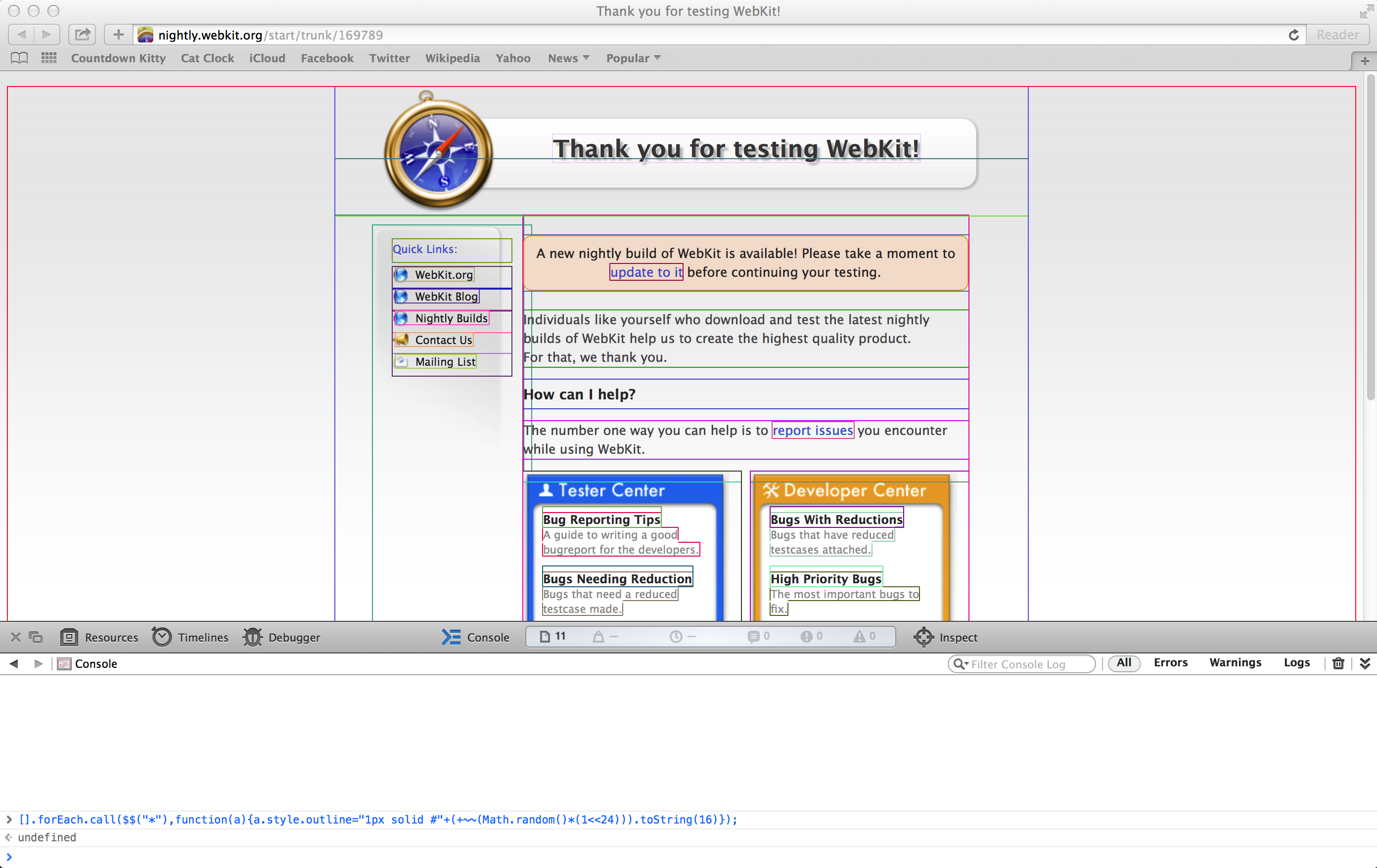 A tweet-sized debugger for visualizing your CSS layouts. Outlines every DOM element on your page a random (valid) CSS hex color.