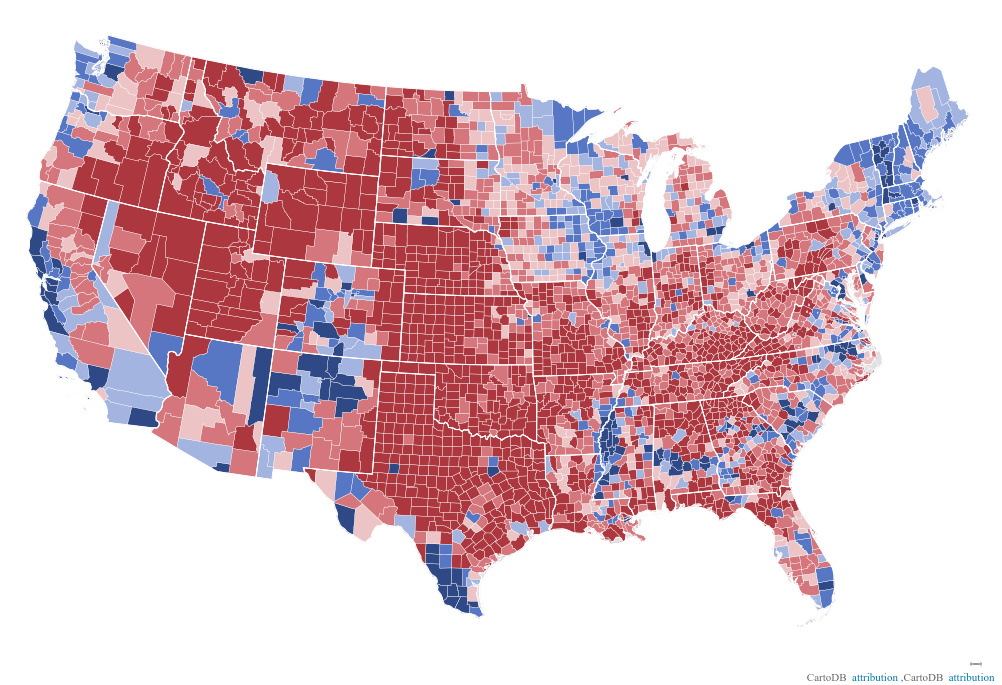 - As a first step, let's color each county based on the winner using the color variables for each candidate based on the