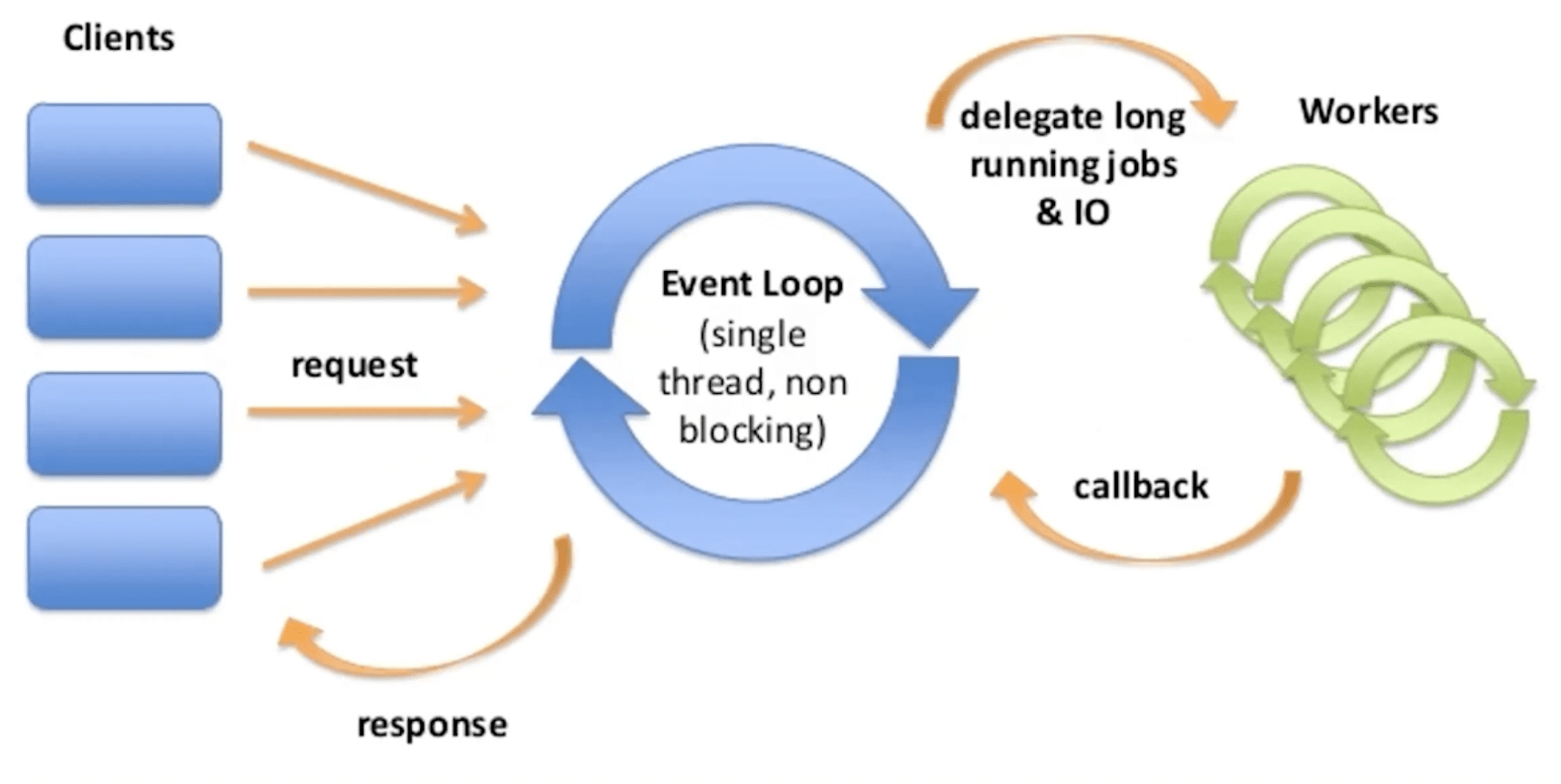- o event loop é single threaded, não bloqueante e responsável por delegar operações lentas e de I/O para workers