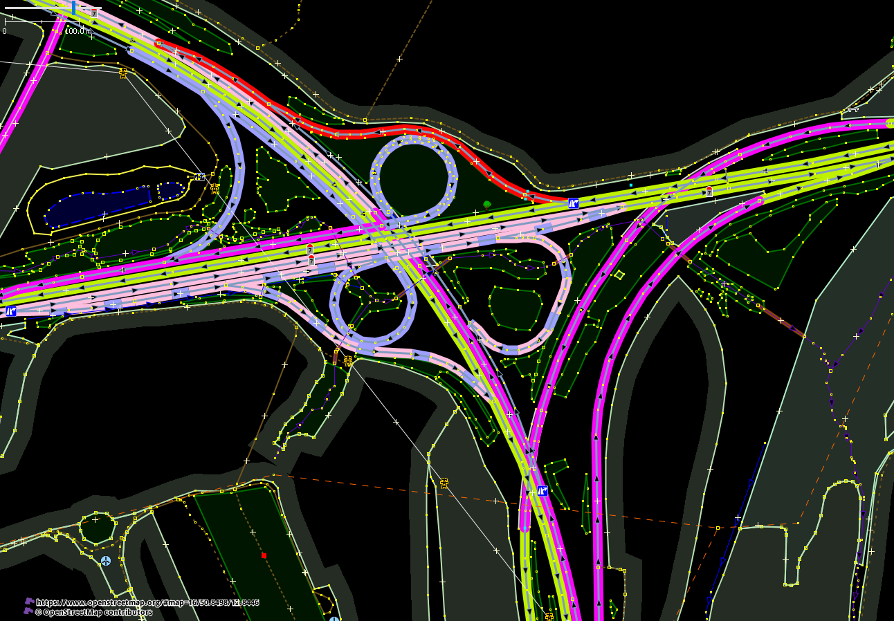 When I load the OSM data, JOSM's Maxspeed style shows me right away that the appropriate segments do not yet have maxspeed information: