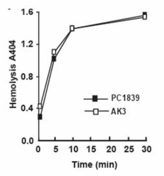 Figure 1: Hemolysis of RBC by S. aureus laboratory strains PC1839 and AK3.