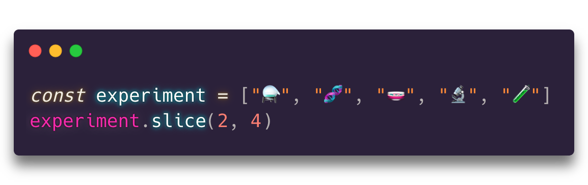 | C | The slice() method copies a given part of an array and returns that copied part as a new array. It doesn鈥檛 change the original array. The syntax is array.slice(from, until); where from is slice the array starting from an element index (2 in this case) and until is slice the array until another element index (4 in this case). However, the slice() method doesn鈥檛 include the last given element. For this reason, "馃И" (index 4) element is not included in the new array. |